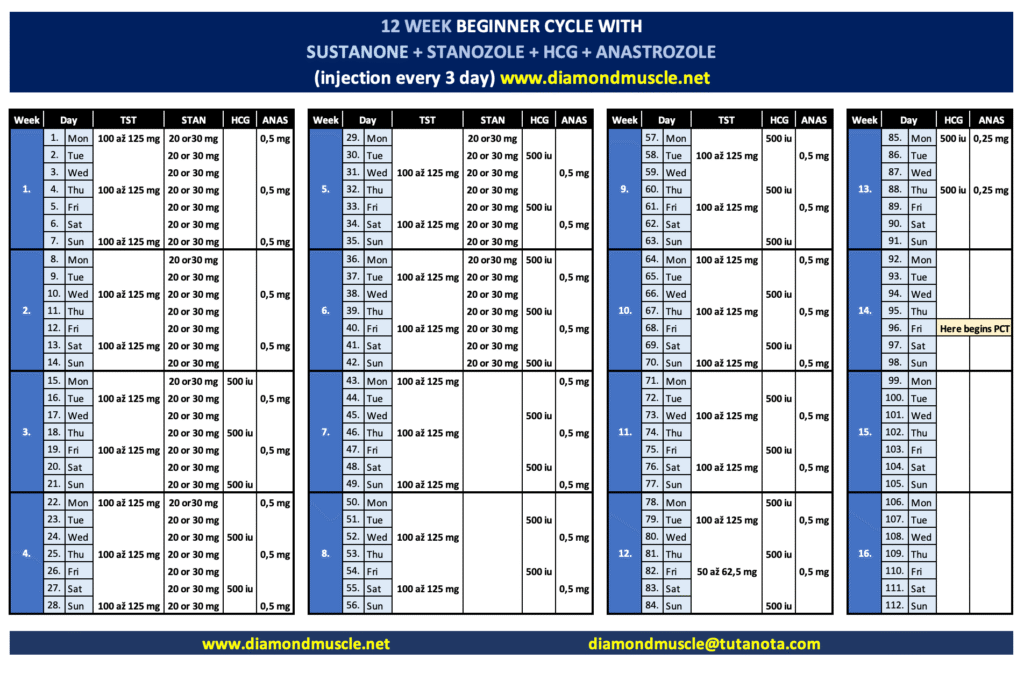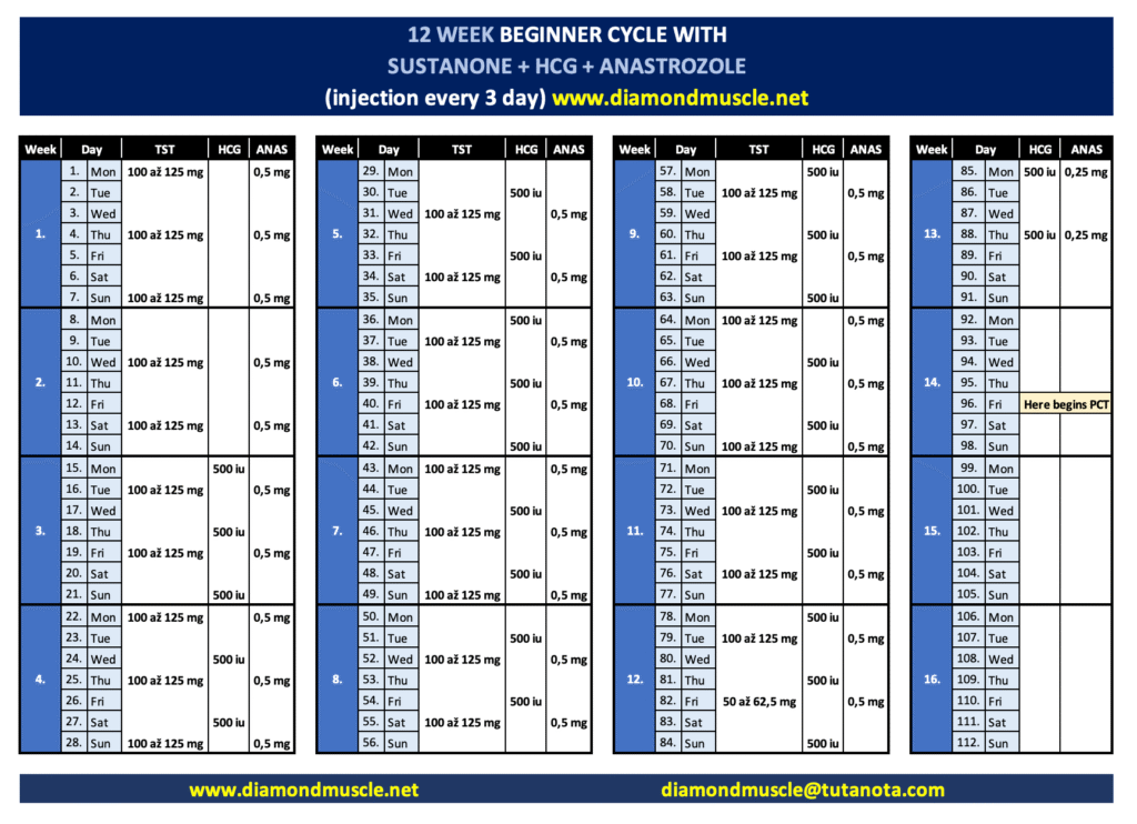 The first cycle, as you may already be used to from my articles, is composed only of Sustanon, without any additional AAS. The cycle lasts 12 weeks, during which HCG is also used to help maintain natural intratesticular production of testosterone, pregnenolone, and DHEA, ensuring better readiness for PCT — this is essential and very important! The cycle also includes an aromatase inhibitor (Anastrozole) to regulate E2 levels during the cycle, which is crucial for preventing possible gynecomastia, maintaining sexual function, and controlling prolactin levels, since long-term elevated E2 may lead to increased prolactin and further complications.